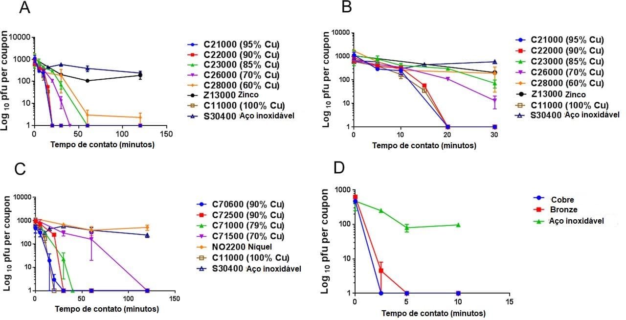 A comparação das ligas de aço inox, zinco e níquel em comparação com revestimentos de diversos teores de cobre está disponível na Figura 1. A análise foi realizada a partir da avaliação das partículas virais encontradas nas unidades formadoras de placa (PFU). É possível verificar que revestimentos de cobre apresentaram excelente desempenho na inativação do vírus HuCoV-229E.